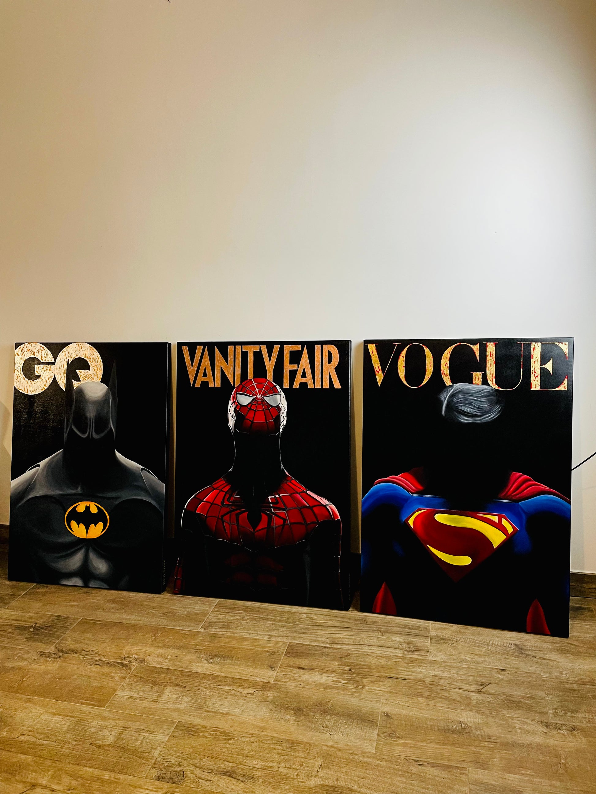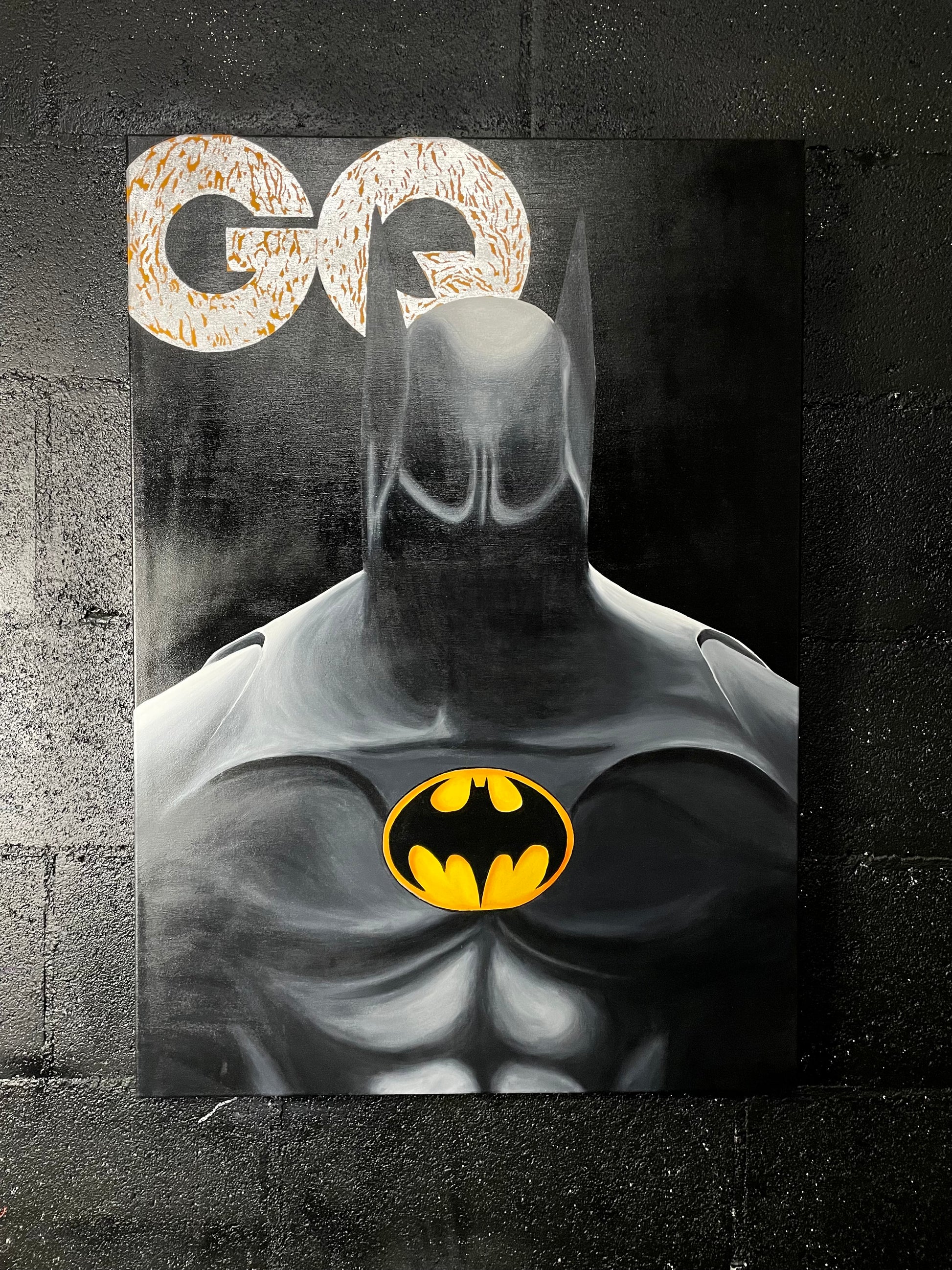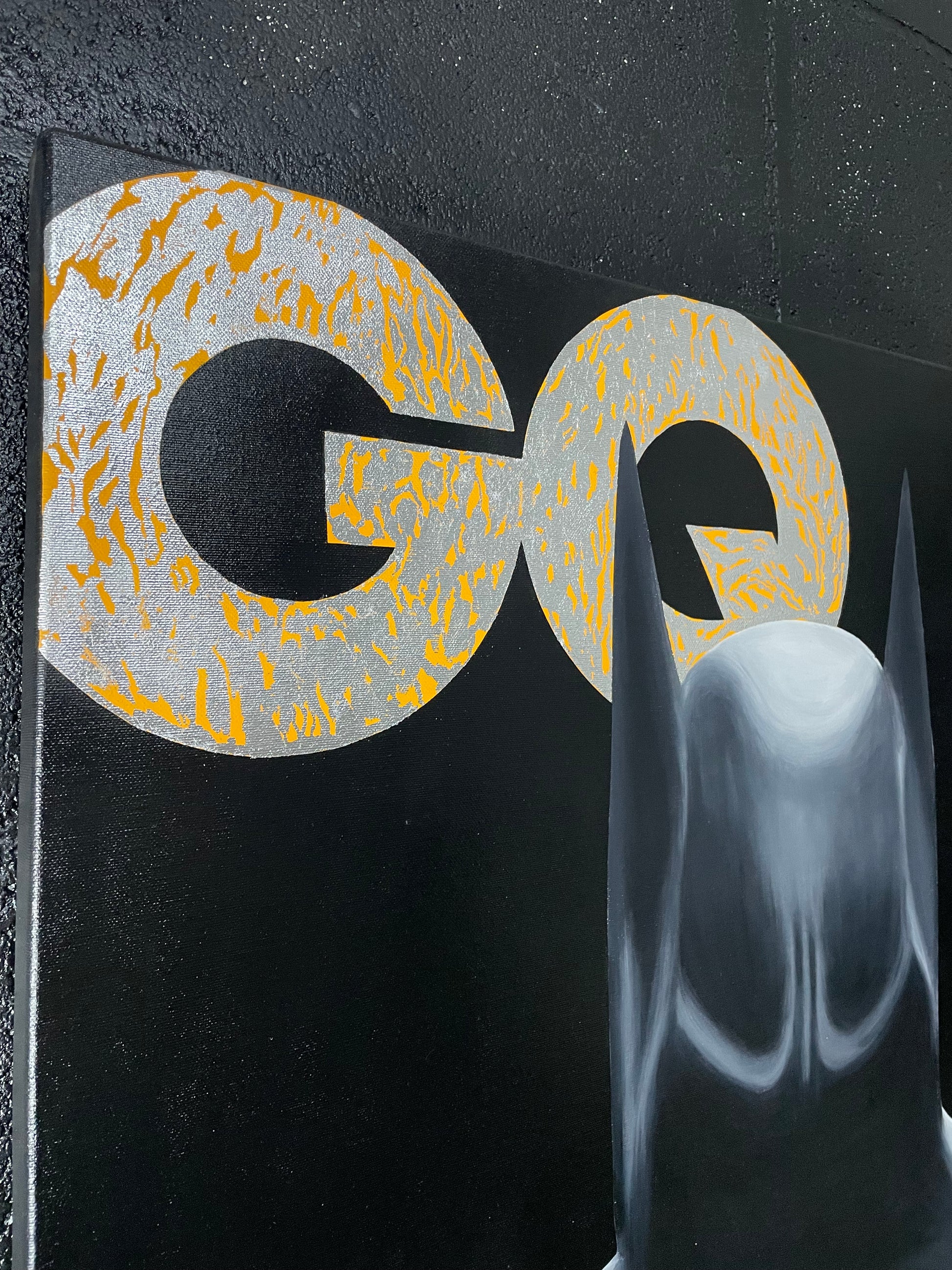 Alle sue spalle campeggia la celebre scritta “GQ”, marchio iconico della rivista maschile che rappresenta stile, eleganza e autorevolezza nel mondo della moda e della cultura pop. La scritta è interamente lavorata in foglia d’argento, scelta non casuale: l’argento, freddo e raffinato, richiama la tecnologia, l’armatura, e la precisione mentale del Cavaliere Oscuro, collegandosi visivamente e concettualmente al personaggio.