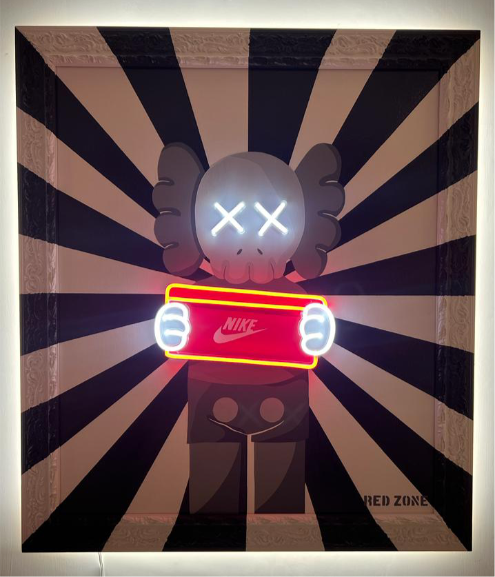 Questa opera, realizzata interamente a mano libera, fonde l’iconico personaggio di KAWS con l’estetica streetwear, creando un tributo vibrante al mondo delle sneakers. La figura, dipinta con dettagli realistici e un tocco grafico pop, emerge con la sua espressione tipica, sospesa tra ironia e malinconia.