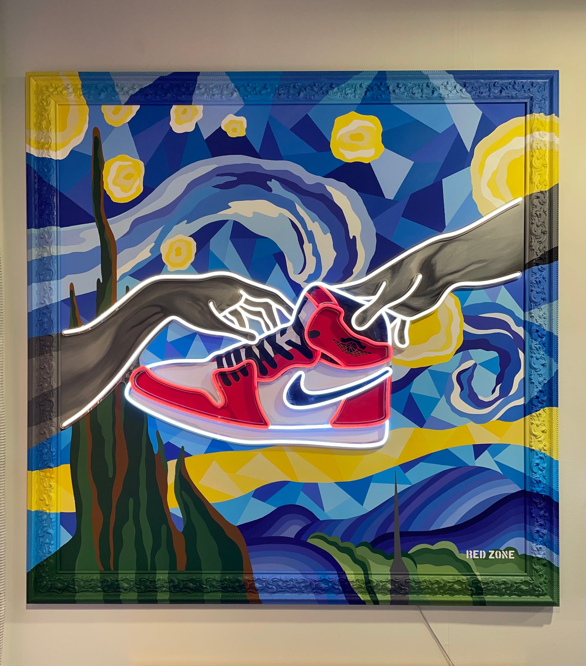 Il quadro non è solo un’interpretazione audace, ma un mix perfetto di stili. Lo sfondo, che richiama la maestosità della Notte Stellata di Van Gogh, viene reinterpretato in chiave geometrica, con linee audaci e forme moderne che si sovrappongono in una danza di colori vibranti. La cornice stessa diventa parte integrante dell'opera, completamente dipinta per continuare il gioco di sfumature e forme, creando un tutt'uno che sfida la tradizionale separazione tra quadro e cornice.