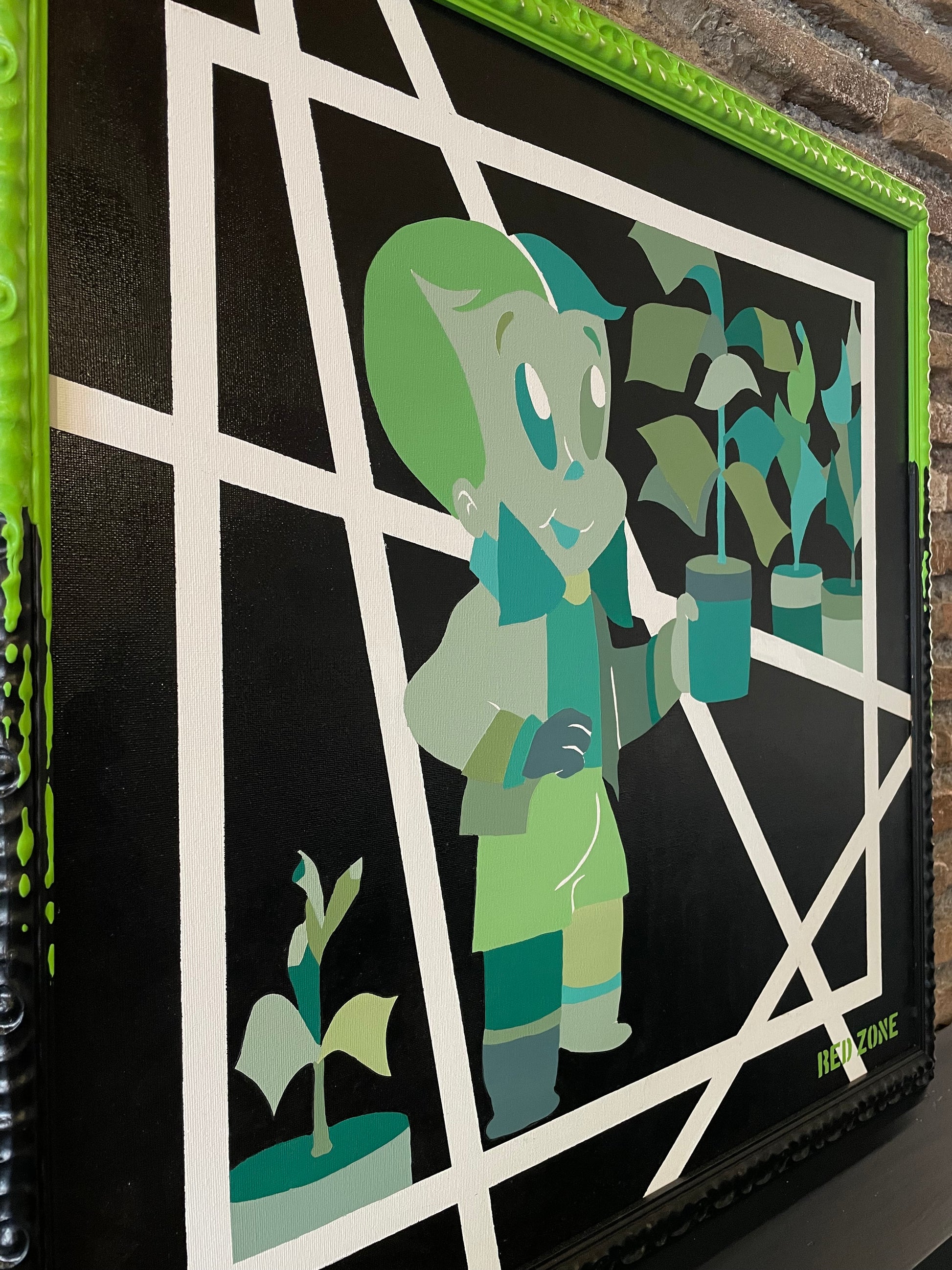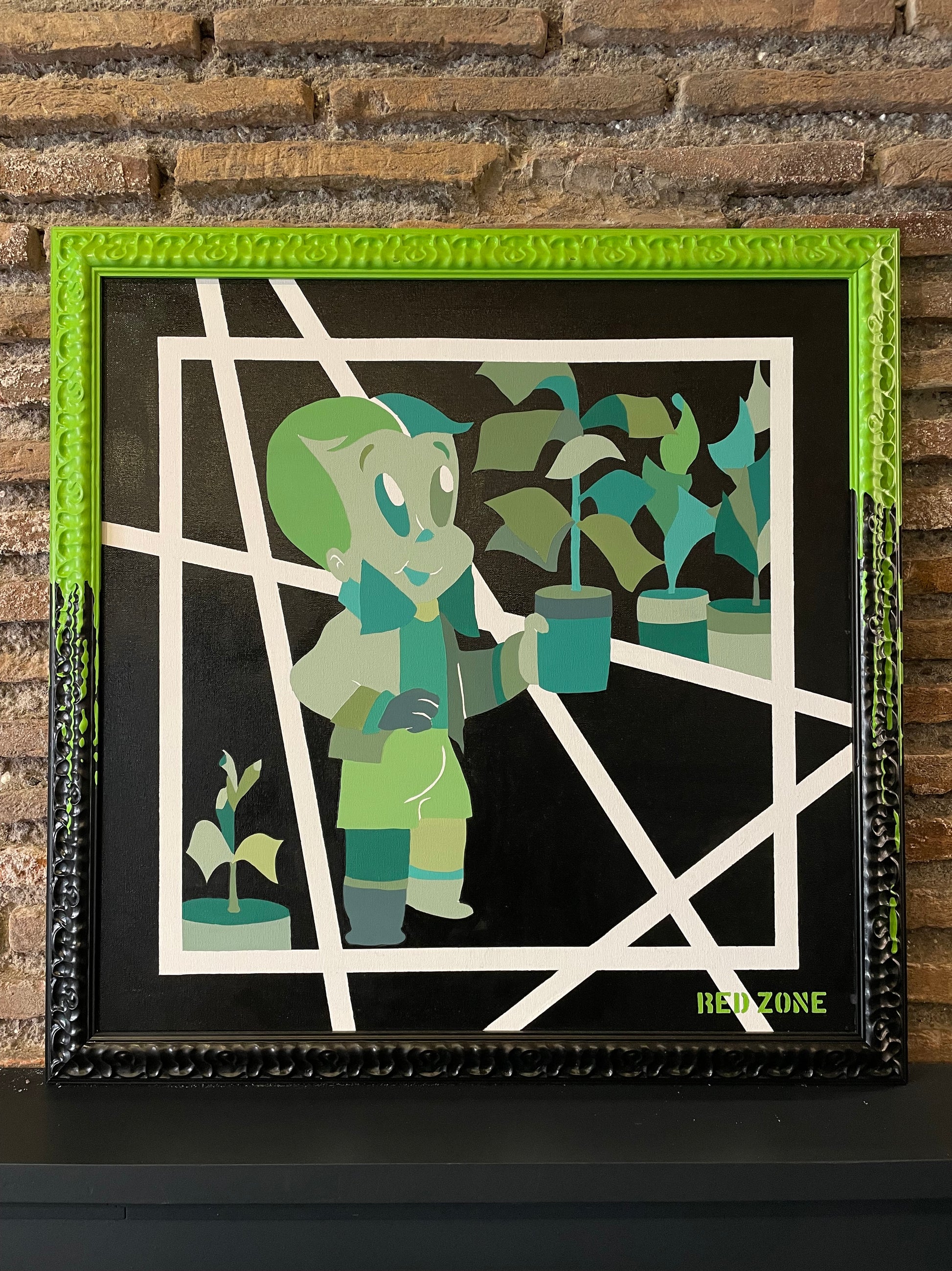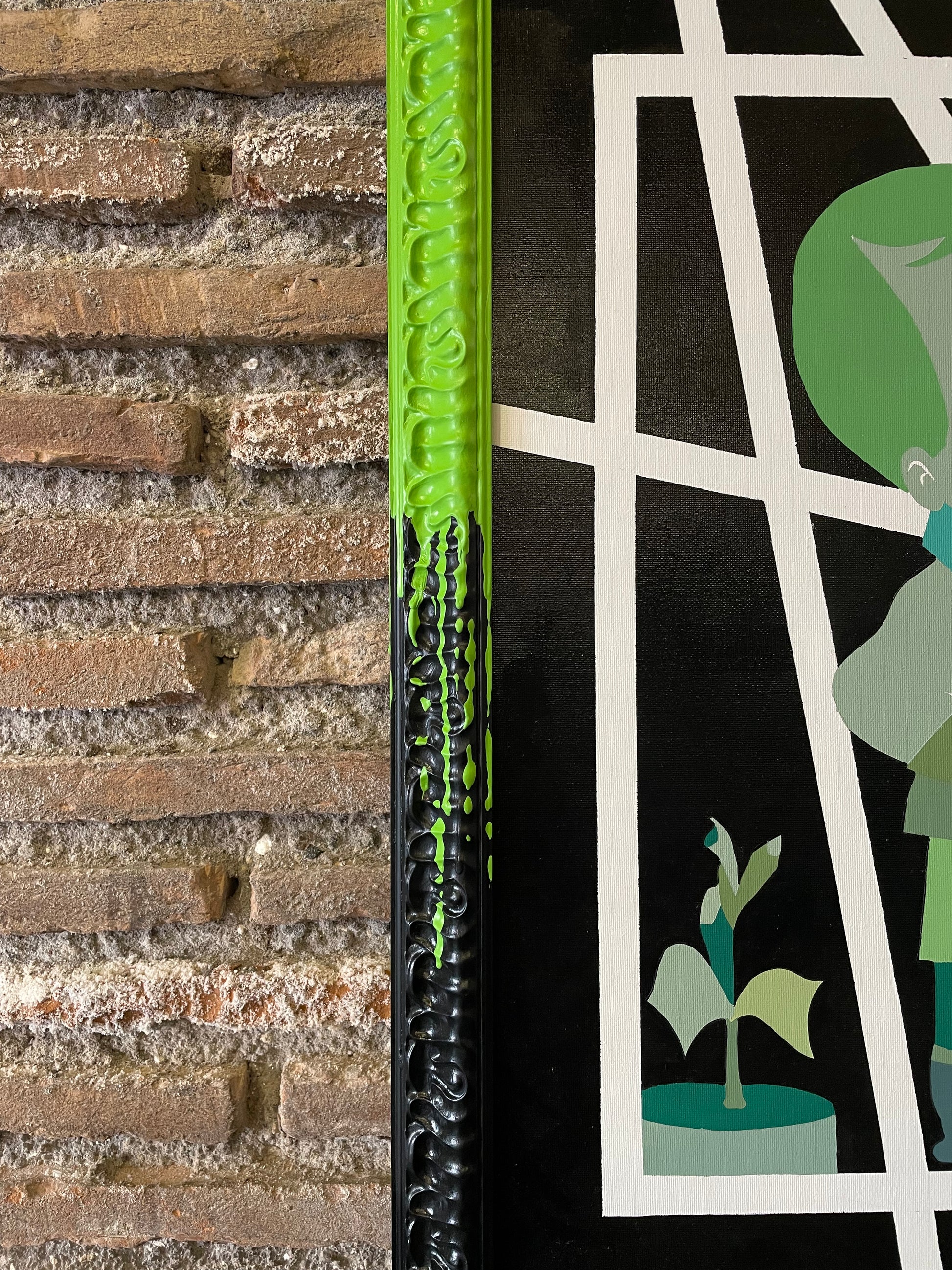 La cornice custom, parte integrante dell’opera, completa il messaggio con colature in acrilico, trasformando il quadro in un oggetto unico: un commento pop, ironico e allo stesso tempo riflessivo sul valore del denaro e sul modo in cui lo inseguiamo fin da piccoli.