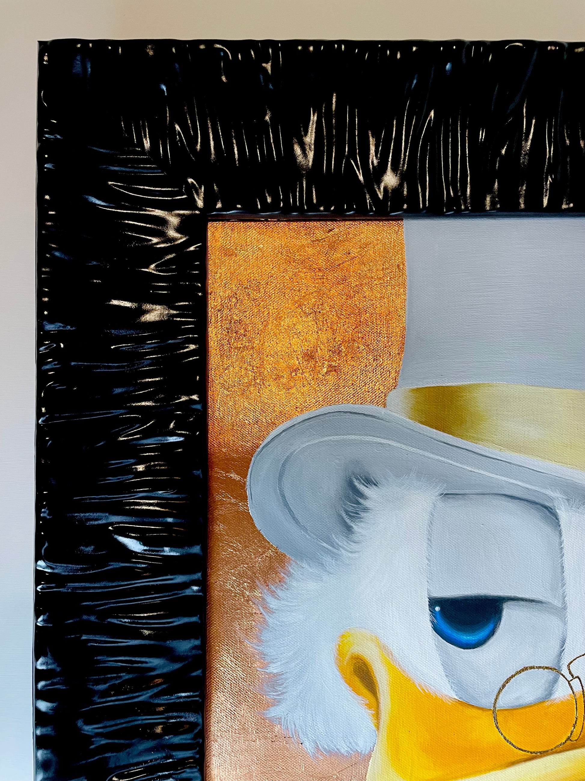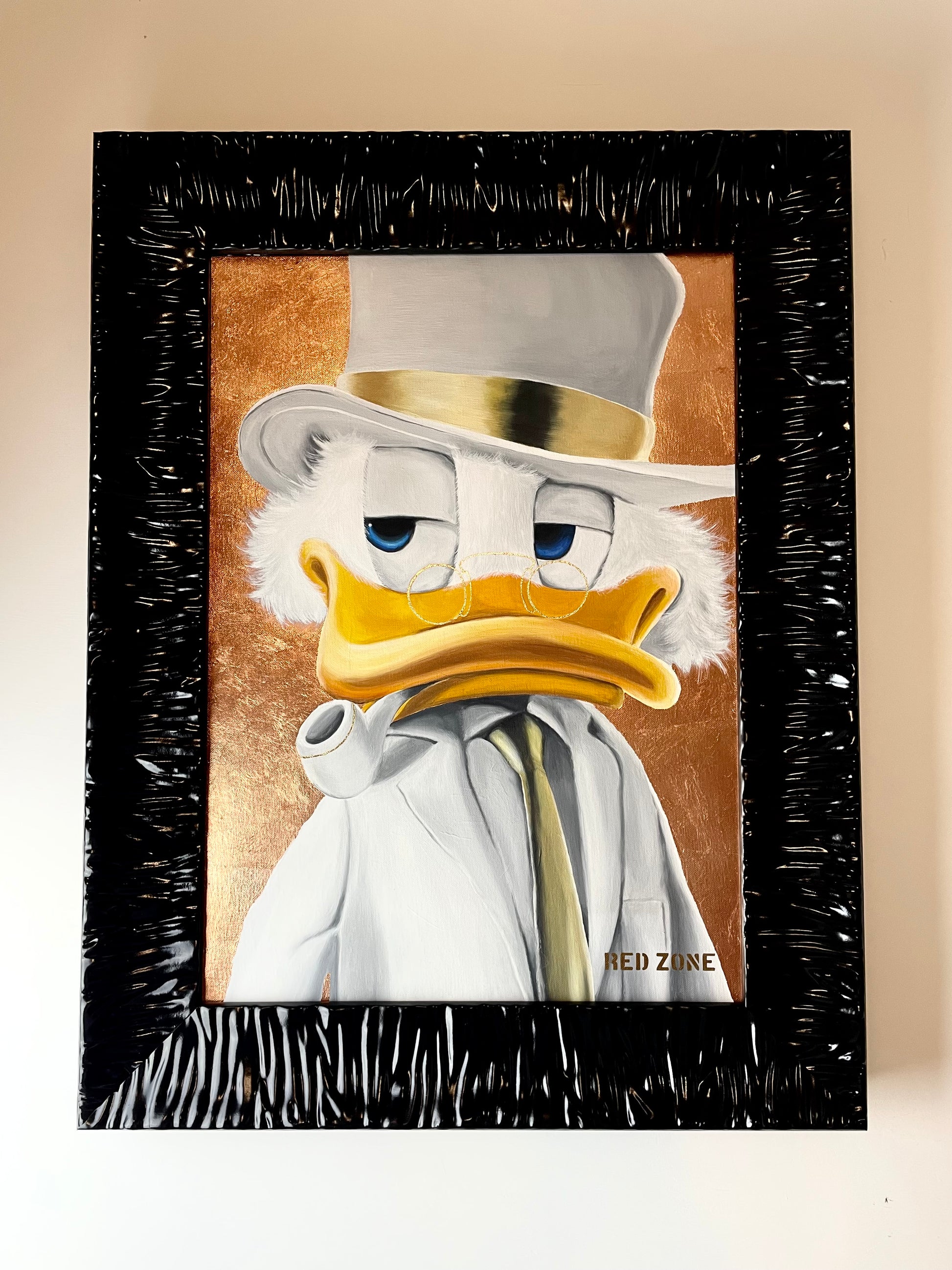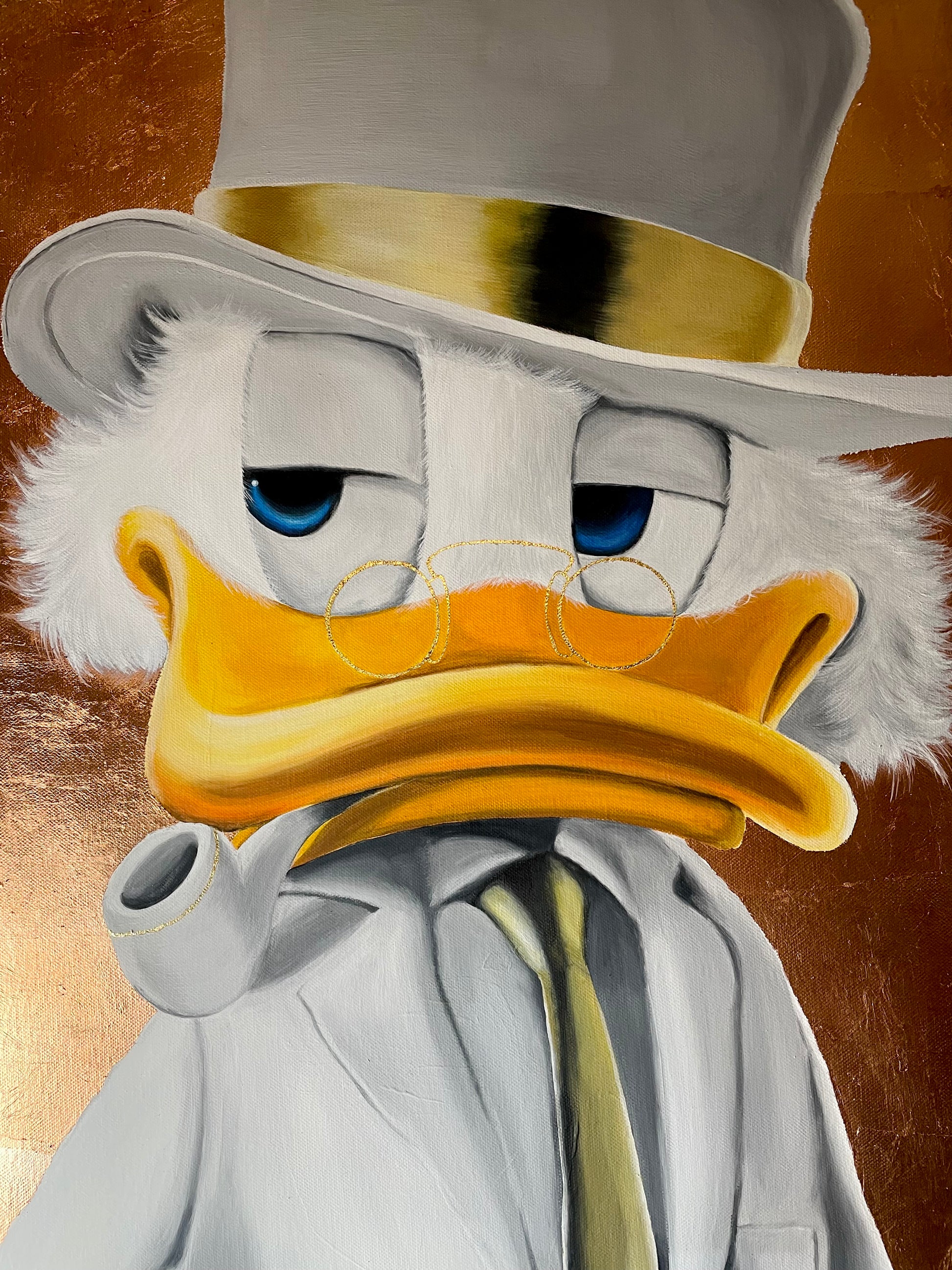 L'opera ritrae Zio Paperone nel pieno della sua attività di business, con una maestria nei dettagli che non lascia nulla al caso. Ogni pennellata di pittura acrilica è studiata per donare profondità e vivacità, mentre l'uso del bronzo e dell’oro conferisce un tocco di lusso e prestigio, illuminando delicatamente l’immagine e creando un gioco di luci e ombre che affascina lo spettatore.